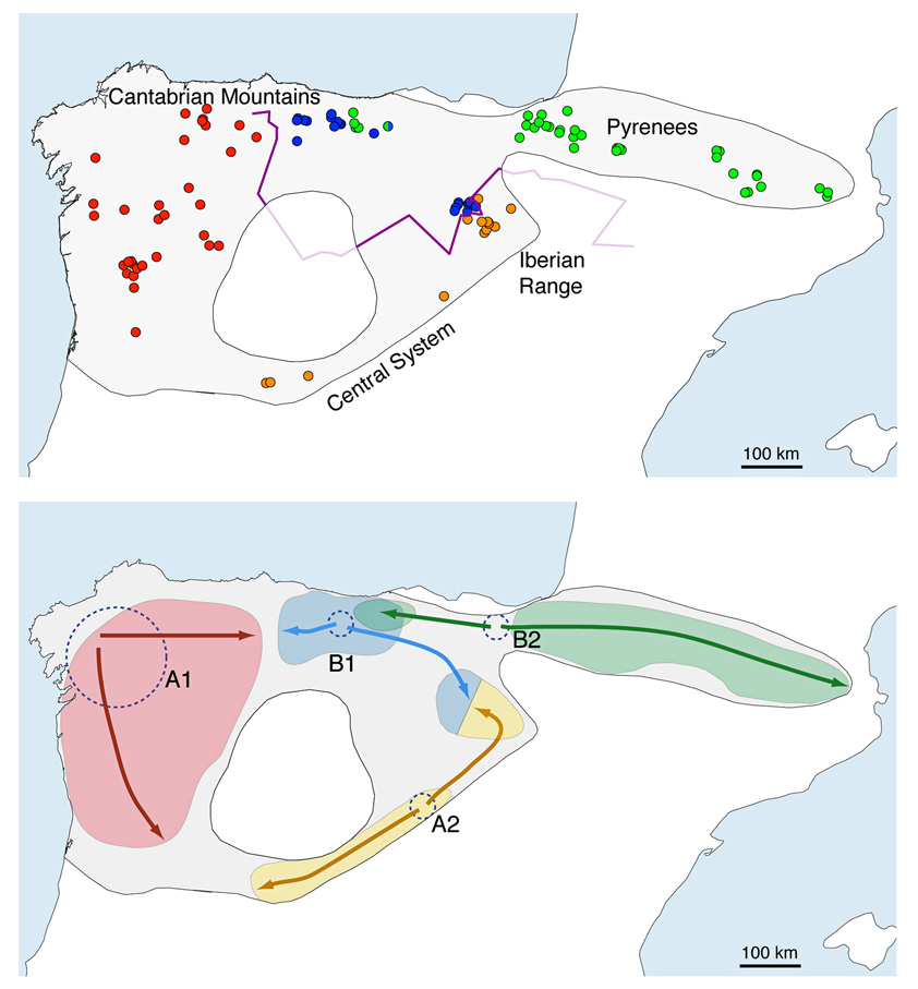 En las siguientes imágenes, la distribución de las cuatro unidades de conservación (arriba) y la localización de los refugios glaciares a partir de los cuales se han originado los cuatro linajes (abajo).