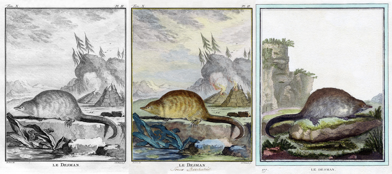 El desmán de la Histoire Naturelle de Buffon (izquierda) no es para tirar cohetes. Encima lo ambienta en Laponia, con los sami en sus lávut ahumando carne de reno. Un guiño a Linné, probablemente. La ilustración gana dramatismo en algunos ejemplares que se colorean para poder venderlos a un precio mayor (centro). El enorme éxito de la obra hace que las ediciones se multipliquen y los ilustradores homenajean al original con mayor o menor fortuna. En el ejemplo de la derecha las tiendas sami son sustituidas por un edificio en ruinas.