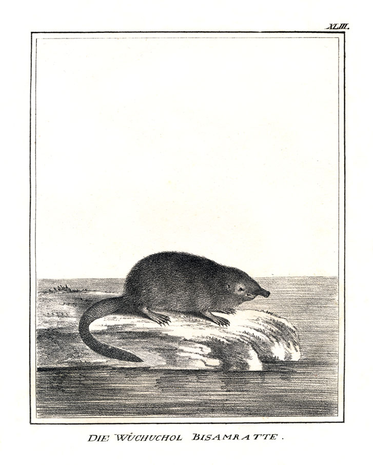 Veinte años tardó Georg August Goldfuss en completar su Naturhistorischer Atlas (1824-1843). Los suscriptores de esta obra debían contentarse con un fascículo al año, de aproximadamente veinte páginas. Entre las 454 litografías que la componen se coló el desmán. El ilustrador reprodujo el desmán de Geoffroy, el de los Pirineos, y Goldfuss lo identificó como Myogale moschata, Cuv., el ruso. El color es el del trabajo original.
