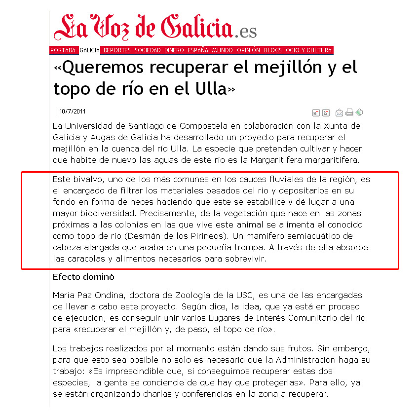 Esta frase absurda y fantasiosa no ha sido extraída de un tratado de criptozoología medieval. Resume el conocimiento que brinda a sus lectores la edición del 10 de julio de 2011 de La Voz de Galicia. Lo extraigo de la entrevista que sufre uno de los investigadores participantes en un proyecto de conservación. Me parece imposible reunir de modo inocente en un solo párrafo tal cantidad de disparates, pero independientemente de la intencionalidad del periodista, este artículo es un buen ejemplo del tratamiento que la prensa diaria española da a la conservación de la naturaleza y, todo sea dicho, a cualquier aspecto de la ciencia.